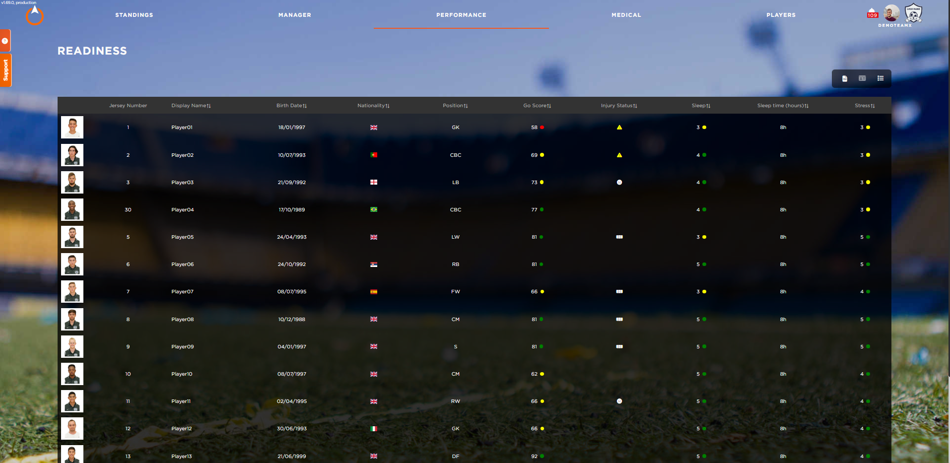 في قسم الاستعداد ، لديك تجاهل لحالة التعب الحالية لفريقك لمعرفة مدى استعداد كل لاعب للأداء.