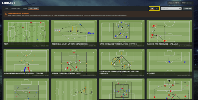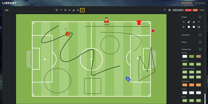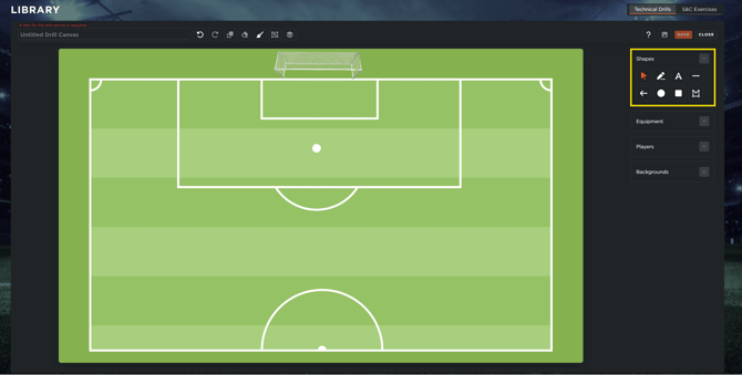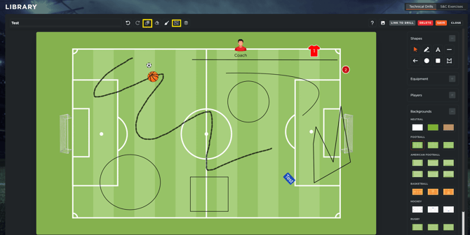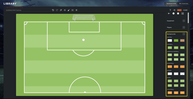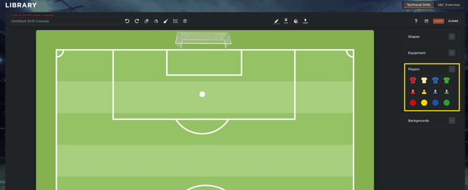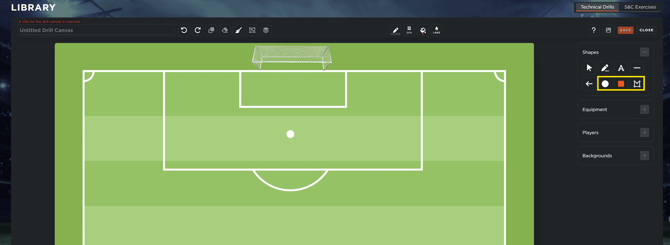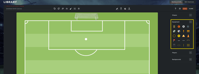 The Drill Canvas features a comprehensive library of icons to represent the physical setup of the pitch and the participants involved.