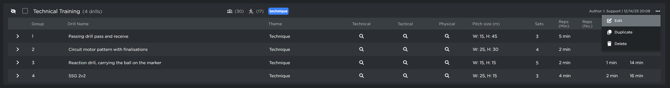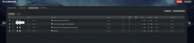 The "Actual" Section: Once a technical session is finished, you can move planned drills into the Actual section by clicking Edit and selecting the Copy to Actual icon. This allows you to adjust the final duration of each drill to reflect the real time spent on the pitch.