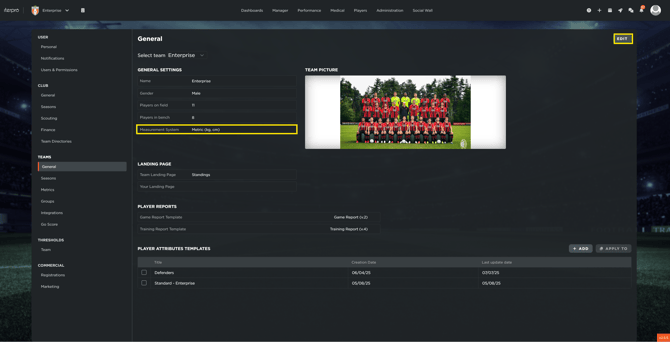 Global Measurement Settings: Before planning S&C sessions, ensure your unit of measurement is correctly configured. Navigate to Settings > Teams > General to toggle between Metric (kg/cm) and Imperial (lbs/ft) systems.