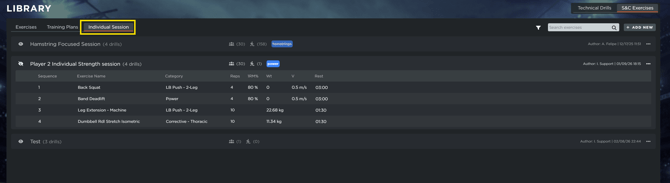 Individualized Programming: Within the S&C Plan tab, clicking on the Plus (+) icon you are able to add exercises, individual sessions or entire training plans for each player.