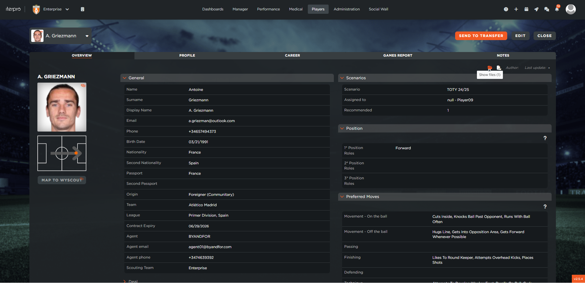 Once you access a player’s scouting profile, the first section you’ll encounter is the Overview. Here, you can set up and edit key details, including personal information about the player and the scout, deal-related information, attributes, playing position, and preferred moves. You can also manage supporting documents through the File Repository, where files related to the player can be uploaded, previewed, downloaded, and shared with selected users.