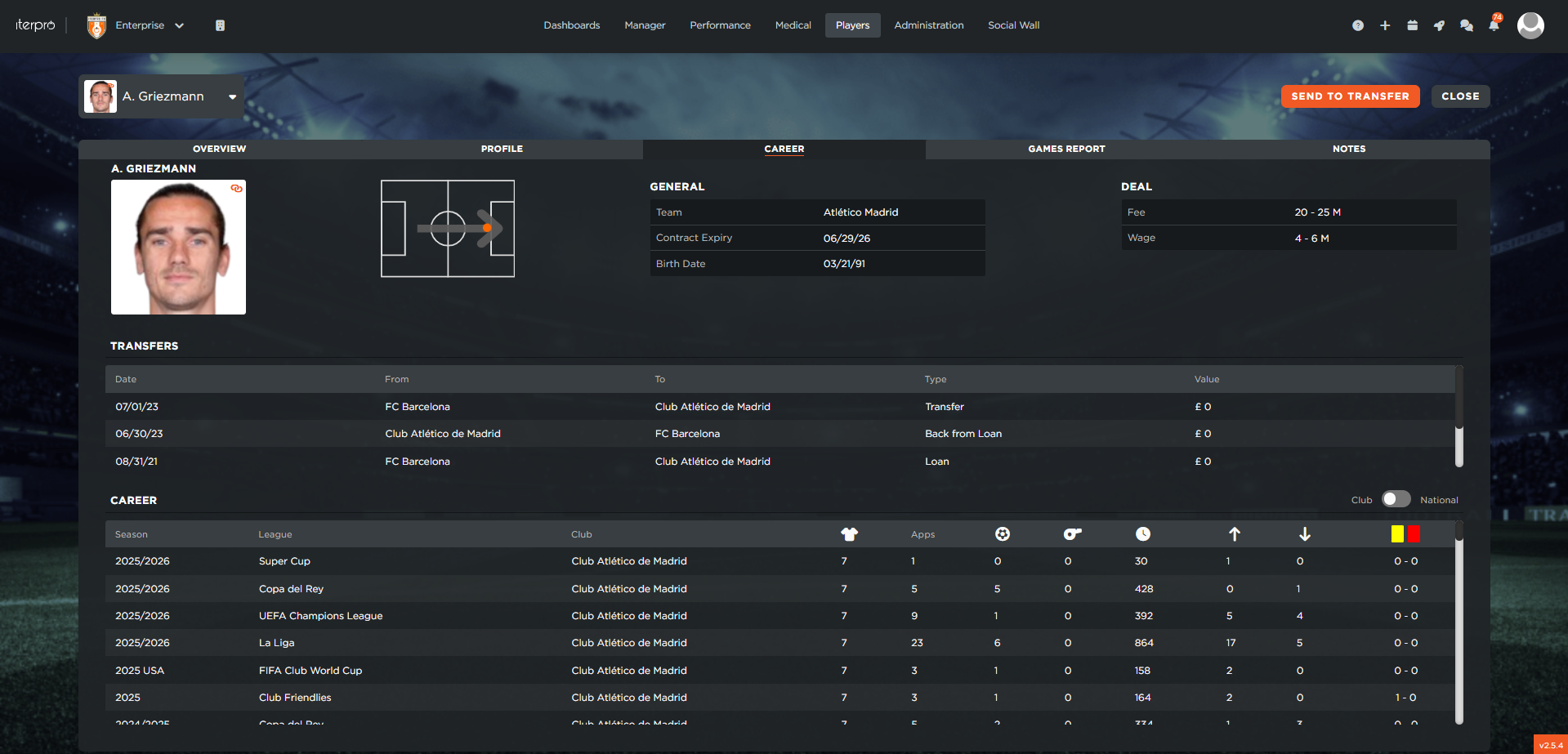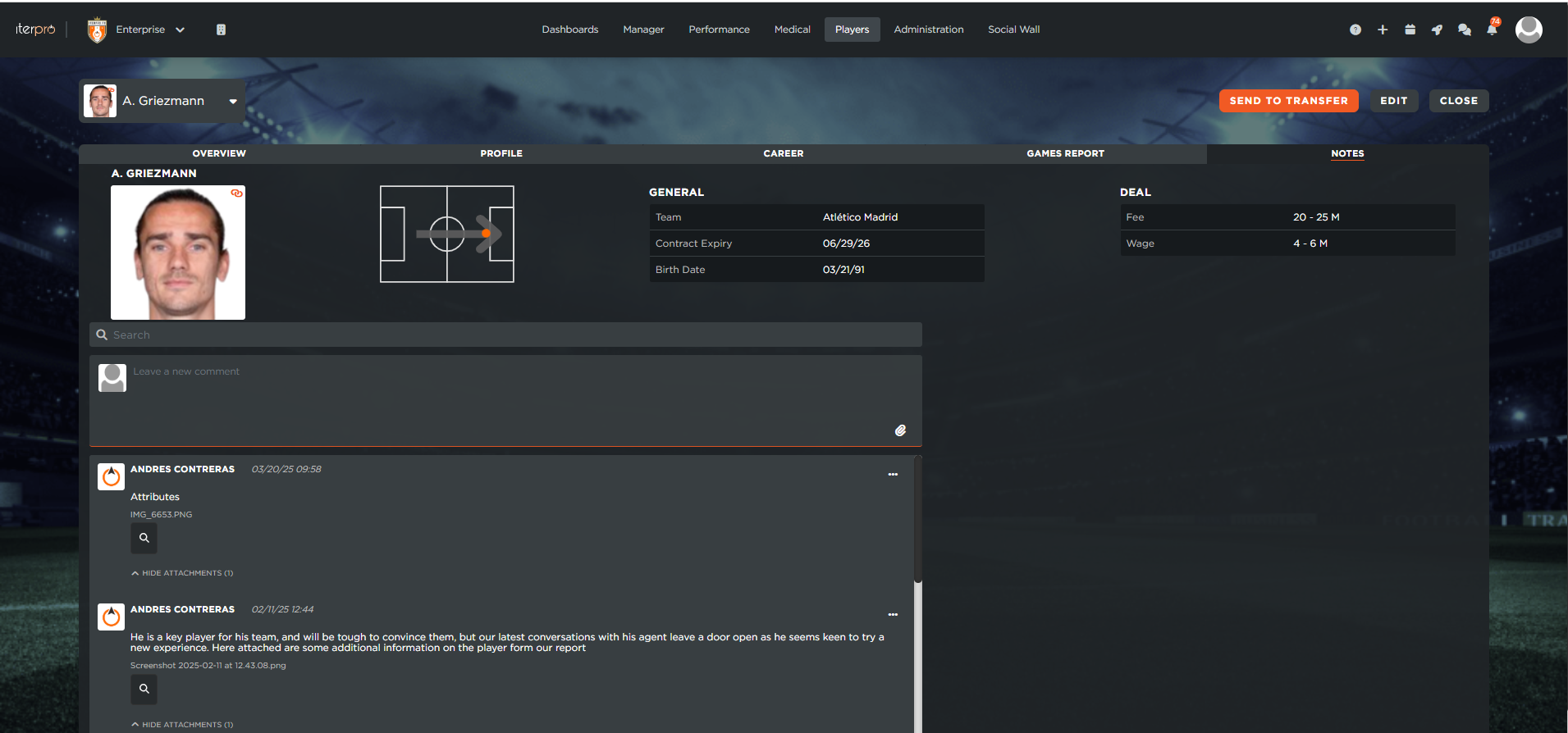 Moving on to the Career section—available only for Wyscout-imported players—you’ll find a history of past transfers and career statistics. The Notes section also allows you to attach relevant notes and maintain a direct communication thread with your scouting team, ensuring that everyone stays updated on the player’s potential transfer movements.