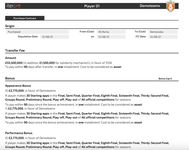 - Condicional: Se pueden establecer condiciones adicionales para que el bono sea válido (por ejemplo, si el jugador firma con el club dentro de un período determinado o si es incluido en la lista de una competición específica).